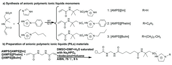 Another approach is to prepare a PIL composed of IL-based monomers. For example, a series of 2-acrylamido-2-methyl propane sulfonate [AMPS−] combined with imidazolium [IM+], phenylimidazolium [PhIM+], butylimidazolium [BuIM+] and N,N-methylenebisacrylamide (MBAA) as crosslinkers was prepared and applied in protein adsorption experiments [114]. Figure 8 shows a schematic illustration of the preparation of these PIL materials. In another example, 1-vinyl-3-butylimidazolium chloride was copolymerized with EDMA to prepare a MIP selective for chlorsulfuron [115]. This MIP was further evaluated to determine chlorsulfuron from water samples by on-line SPE-LC-UV and achieved recoveries greater than 80%. Several other examples of ILs as materials for SPE can be found in reviews of the subject [116,117].