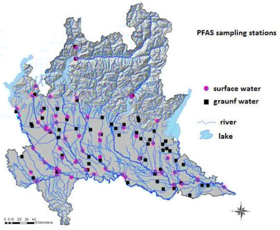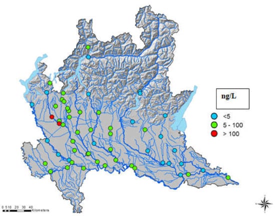 PFASs concentrations were, in most cases, below the limits of quantification and, in the cases where the limits of quantification have been exceeded, the values found were lower than the Italian Directive No. 172/2015 (from 100 to 3000 ng L−1). PFOS is an exception and in fact this compound was detected in 76% of analyzed samples (surface and groundwater) (see Table 6). This data highlights the directly or indirectly (by using consumer products) PFOS use in Lombardia Region.