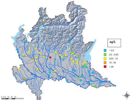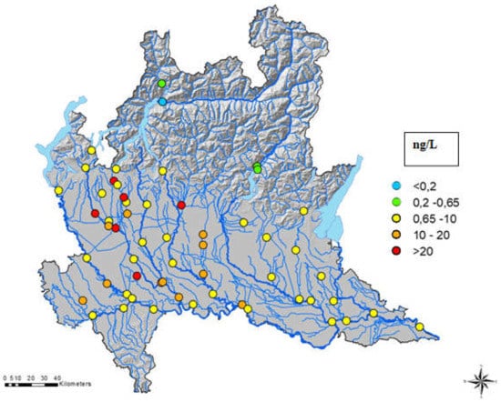 The maximum concentration of PFOS was found in the sampling carried out in June in Legnano station on the Olona river (29.4 ng L−1). Comparable values were found on the Olona stream (22 ng L−1), Rho (17 ng L−1) and Pero (21 ng L−1) on the Olona river.
