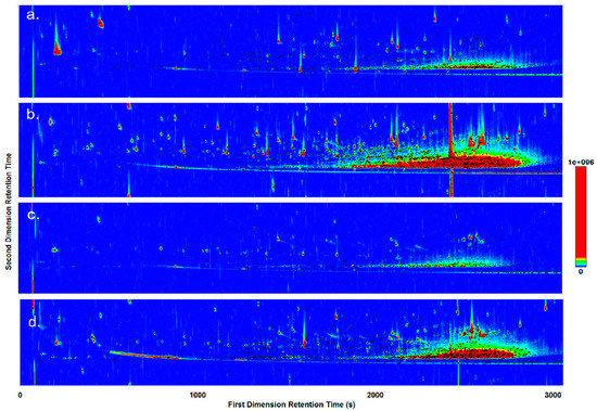 The volatilomes of various wildlife specimens were analysed to determine the applicability of volatilome profiling as a non-destructive, forensic screening method to resolve the identity of confiscated wildlife contraband. To do so, a small volatilome library was constructed using known ivory specimens, the other teeth and bone samples, and unknown, suspected ivory specimens. The initial separate characterisations of the volatilome profile of each sample was completed using GC×GC-TOFMS and a range of compound groups, including known odour-producing compounds, were reported. The total ion chromatograms (TIC) (Figure 1a–d) display the data obtained from the analysis. Clear visual distinctions were observed from the generated chromatograms of the bone samples, represented here by koala bone (Figure 1b) and the DoEE seizures suspected ivory sample (Figure 1c,d). The known ivory samples had an average of 320 identified compounds (Figure 1a). The number of identifiable compounds in the koala bone samples was considerably higher, totaling 450 VOCs. Approximately 360 compounds were identified in the unknown samples.