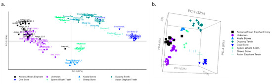 Teeth from other mammalian species including dugong (Dugong dugon), n = 4; sperm whale (Physeter microcephalus), n = 2; and Asian elephant (Elephas maximus), (n = 1); as well as bones from cow (Bos Taurus) [21,22], (n = 5); sheep (Ovis aries), (n = 1); and koala (Phascolarctos cinereus), (n = 4); were analysed to determine if separations were related to species or item composition chemical/biological structure. Details of these samples are in Table 2.