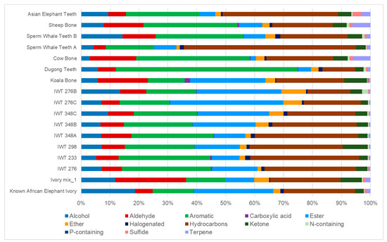 The eight unknown seized samples from the DoEE consisted of the same compound groups (Figure 3). In addition, these appeared to be in similar ratios, with the exception of carboxylic acid volatiles. In IWT 276 and 233, the component percentage of this compound class was higher than in the other unknown samples. The ivory mixture had a higher component percentage of aldehydes than the average pre-identified known ivory and unknown seized samples. The pre-identified known ivory and the Asian elephant tooth were visually comparable to the unknown seized samples, though the Asian elephant tooth had a greater abundance of hydrocarbon volatiles and a smaller abundance of esters than any of the unknowns (Figure 3). The unknown seized samples could therefore also potentially be eliminated as being of Asian elephant origin, strengthening the view that these unknown samples are most likely of African origin based on this volatilome classification.