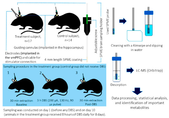 29] with the aim of performing the untargeted in vivo analysis of rodent’s brain after deep brain stimulation (DBS). Metabolite changes occurring in brain hippocampi after 3 h of DBS and after 8 days of daily DBS therapy were evaluated. Findings demonstrated that acute DBS was able to produce changes in the levels of several metabolites like citrulline, phosphor- and glycosphingolipids, whose concentration levels increased after the therapy. By contrast, after chronic DBS, a decrease in the corticosterone levels were observed.