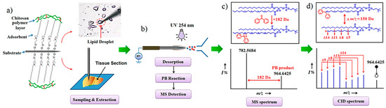 + ions, whereas only a few signals from fatty acids were obtained in negative ion mode. The developed BSCP-nanoESI-HRMS method was compared with conventional direct infusion shotgun MS lipidomics by analyzing tissue extracts. A similar lipid profile was obtained, even though differences in the relative signal intensities were observed. The effectiveness of the coating extraction was demonstrated by sampling zebrafish tissues using uncoated probes, resulting in weaker MS signals. Coating stability was assessed by performing the extraction multiple times using the same probe. No decrease in peak intensity was observed and carryover effect of the coated fiber resulted negligible. The lipid species detected by BSCP-nanoESI-HRMS method were identified via LIPID MAPS structure database. Analysis of zebrafish dorsal-epaxial muscle led to the identification of 137 lipid species excluding isomers, i.e., 57 triradylglycerol (TAG) species, 33 phosphatidylcholine (PC) lipids, 28 phosphoglycerols (PGs), 10 ceramide-1-phosphates (CerPs), 3 fatty acids, (FAs), 2 diradylglycerols (DAGs), 2 cholesteryl esters (CEs), 1 monogalactosyldiacylglycerol (MGDG), and 1 phosphtatidylinositols-ceramide (PI-Cer). The lipid profile of single zebrafish eggs was also obtained: the most intense ions were identified as PC(16:0/18:1) and PC(16:0/22:6) lipids, whereas the signal intensities of many TAGs were much lower compared with those of zebrafish muscle. Principal component analysis (PCA) analysis was applied, showing that zebrafishes and their egg cells were clearly separated into two clusters and the major loadings were attributed to TAGs. Despite the developed method proved to be suitable for the detection of lipid species in living tissues, the accurate location of the C=C bond within the fatty acid chains could not be unambiguously assigned. In addition, isomers could not be differentiated due to the lack of a chromatographic separation. To solve the discrimination of C=C lipid isomers, online Paternò-Büchi (PB) reaction has been proposed [