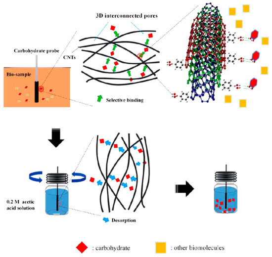 Carbohydrate detection in aqueous media, biofluids and tissues is challenging due to the high affinity of these compounds toward water. Owing to its capability of interacting with diols in a rapid and reversible way, phenylboronic acid functionalized MWCNTs, using PAN as binder has been proposed by Chen et al. to develop a custom-made SPME probe (
