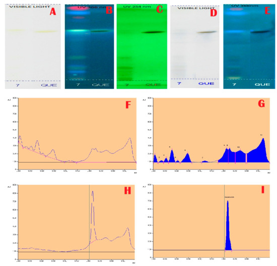 Total Phenolic Profile and Chromatogram of A. aethiopicum. (A): HPTLC profile of A.aethiopicum under visible light; (B): HPTLC profile of A. aethiopicum under UV light at 366nm before derivatization; (C): HPTLC profile of A. aethiopicum under UV light at 234 nm before derivatization; (D): HPTLC profile of A. aethiopicum under visible light after derivatization; (E): HPTLC profile of A. aethiopicum under UV light at 366 nm after derivatization; (F): HPTLC chromatogram of methanolic extracts of A. aethiopicum—base line display scanned at 254 nm; (G): HPTLC chromatogram of methanolic extracts of A. aethiopicum—peak densitogram display scanned at 254 nm; (H): HPTLC profile of standard—peak baseline display scanned at 254 nm; (I): HPTLC chromatogram of standard Quercetin—peak densitogram display scanned at 254 nm.