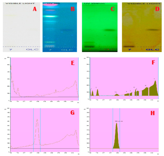 Tannins Profile and Chromatogram of A. aethiopicum. (A): HPTLC profile of A. aethiopicum under visible light; (B): HPTLC profile of A. aethiopicum under UV light at 366 nm before derivatization; (C): HPTLC profile of A. aethiopicum under UV light at 234 nm before derivatization; (D): HPTLC profile of A. aethiopicum under visible light after derivatization; (E): HPTLC chromatogram of methanolic extracts of A. aethiopicum—base line display scanned at 254 nm; (F): HPTLC chromatogram of methanolic extracts of A. aethiopicum—peak densitogram display scanned at 254 nm; (G): HPTLC profile of standard Gallic acid—peak baseline display scanned at 254 nm; (H): HPTLC chromatogram of standard Gallic acid—peak densitogram display scanned at 254 nm.