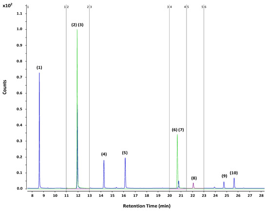 GC-Q-MS chromatogram obtained under SIM mode. Concentration of all the analytes: 75 µg L−1. Concentration of the ISs: 125 µg L−1. Peak identification: DPP (1), DBP-d4 (2), DBP (3), DIPP (4), DNPP (5), DHP-d4 (6), BBP (7), DEHA (8), DCHP (9), and DEHP (10).