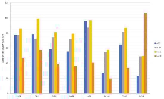 Regarding the elution solvent, ACN, MeOH, DCM and EtOAc were tested by carrying out duplicate extractions. A matrix-matched standard of the expected final concentration was also analyzed in each case to compare the peak areas and to calculate absolute recovery values. Elution was performed with each solvent using a volume of 10 mL plus 2 × 5 mL more (a total of 20 mL) in order to simultaneously study the elution volume. After the evaporation of the three consecutive eluates separately (10, 5, and 5 mL) in a rotary evaporator at 40 °C and at the ideal/recommended vacuum pressure (180 mbar for ACN, 200 mbar for EtOAc, 220 mbar for MeOH and 700 mbar for DCM), 400 µL of cyclohexane were added and sonicated. Finally, 2 µL were injected in triplicate in the GC-MS system (n = 3). As shown in Figure 2, 10 mL of DCM or EtOAc provided similar results and the highest absolute recovery values for most of the analytes. In particular, absolute recovery percentages above 75% were obtained for DPP, DBP, DIPP, DNPP, BBP, and DCHP with both of them. Recovery of DEHA (which is not a PAE) was nearly 60% while DEHP recovery was close to 50%. On the contrary, ACN and MeOH provided the worst results, except for DEHP with MeOH which recovery values were higher. It was also observed that above 10 mL of each solvent, analyte recovery did not improve. In addition, the reduction of the elution solvent volume was also tested below 10 mL, but it was observed that elution was incomplete. Among EtOAc and DCM, the first was selected since it is not a chlorinated solvent like the second.