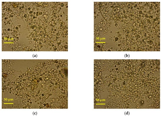 It is reported that the entrapment of zeolite in the microorganisms of activated sludge, especially nitrifiers, can increase the size of microbial flocs and result in enhanced settlement [23]. Recently, it was also found that the adjustment of the population of filamentous bacteria can reduce membrane fouling in MBRs [24]. Aiming to determine if the addition of bentonite and zeolite influence the number of filamentous microorganisms and, therefore, the settling capacity and fouling propensity of the MBR biomass, optical microscopy images were taken before and after the addition of both minerals to the mixed liquor samples at their optimal concentrations (Figure 7). As shown in Figure 7a, the number of filamentous microorganisms is relatively low before the addition of bentonite or zeolite (blank measurement), corresponding to a FI~2. Figure 7b–f reveal that the addition of bentonite and zeolite did not affect significantly the population of filamentous microorganisms and the obtained images present almost the same profile. This is rather expected since the short-term nature of the batch-mode experiments does not favour the development of filamentous bacteria in the biomass that will entrap mineral particles, and thus increase the size of bio-flocs.