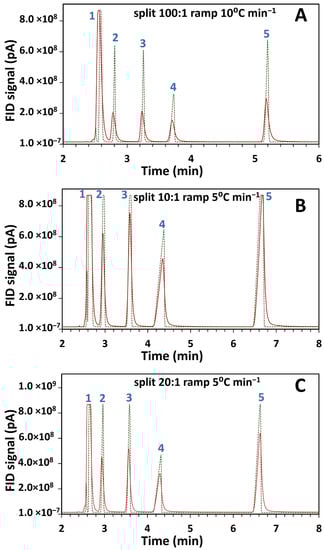 Comparison of flame ionisation detector (FID) results for overlaid chromatograms of gas chromatography-Fourier transform infrared-FID (GC–FTIR–FID) (continuous line) and GC–FID (dotted line) using a standard component mix injected at 50 °C and analyzed with different split ratios and temperature ramps as (A) 100:1, 10 °C min−1, (B) 10:1, 5 °C min−1, and (C) 20:1, 5 °C min−1. Components corresponding to the peaks are (1) dichloromethane (DCM) (solvent peak), (2) 2-butanol, (3) 2-pentanone, (4) 1-nitropropane and (5) m-xylene.
