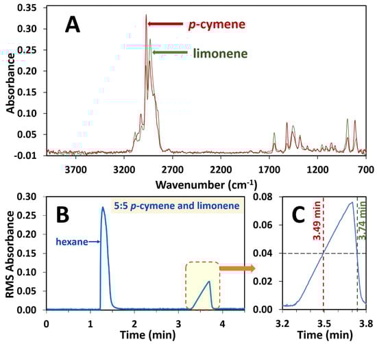 Depiction of extraction of spectra at 0.04 RMS absorbance intensity of the single unresolved chromatographic peak due to co-eluting components in a 5:5 ratio mixture of p-cymene and limonene essential oil standards. p-cymene and limonene often overlap on GC columns and are deliberately overloaded here to illustrate the power of FTIR to deconvolute overlapping peaks. (A) Spectrum of p-cymene at 3.49 min and spectrum of limonene at 3.74 min, both at 0.04 RMS absorbance. (B) RMS absorbance chromatogram with the overloaded peak, which is enlarged (C) to illustrate the extraction of each spectrum at 0.04 RMS absorbance.