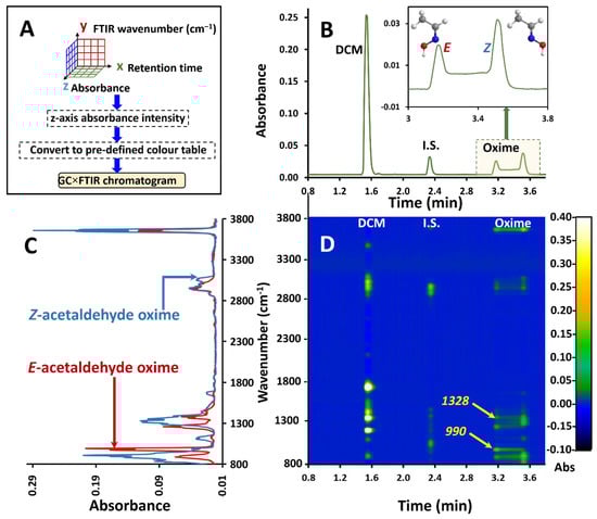 (A) Flow chart of the approach to GC×FTIR. (B) GC–FTIR RMS response profile of interconversion of E and Z acetaldehyde oximes on the GC PEG phase column. (C) Overlay of corresponding FTIR spectra for E and Z acetaldehyde oxime acquired from the GC–FTIR experiment. (D) GC×FTIR 2D colour contour profile illustrating absorbance responses for each compound in the time/wavenumber space. Arrows 990 and 1328 refer to the bands at 990 cm−1 and 1328 cm−1 which are stronger and more selective for the E and Z isomer respectively.