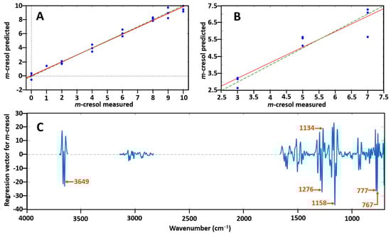(A) Predicted m-cresol concentration ratio vs. measured m-cresol concentration ratio with the use of the partial least squares (PLS) regression model; (B) prediction set of m-cresol; and (C) loadings plot corresponding to the PLS model with labelling of the most significant bands which allow prediction of m-cresol from p-cresol. In both (A) and (B) the green dotted line represents the expected 1:1 proportional fit whilst the red continuous line shows the fit calculated by the model on the test data.