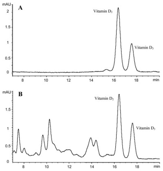 As indicated at the beginning of this section, in some cases, the characteristics of the evaluated samples have made necessary the combination of SPE with other extraction and clean-up procedures to get an efficient extraction. Especially remarkable is the work carried out by Bilodeau et al. [10], in which the evaluation of D3 and its metabolite 25-OHD3 was carried out in pork, beef, egg, chicken, turkey, dolphinfish, salmon and tilapia, using a HPLC-diode array detector (DAD) for the quantification of D3 and HPLC-(QqQ)-MS/MS for 25-OHD3. Sample pre-treatment consisted of an initial alkaline saponification of the sample at room temperature using pyrogallol as the antioxidant agent, followed by LLE four times with 150 and 75 mL of petroleum ether/diethyl ether (2/8, v/v), washing with 5% KOH (one time) and water (twice), subsequent SPE, using 1 g of silica and 0.4–3% of IPA/DCM as the elution solvent, and semi-preparative HPLC using a normal phase column. Recovery values in the range 73–88% and an LOD of the method of 0.4 µg/kg demonstrated the suitability of the developed methodology. The reduction of matrix interferences and noise was considerable after de-application of the semi-preparative HPLC clean-up, especially for the determination of D3 by UV, as can be seen in Figure 2, in which the HPLC-UV chromatograms of the separation between D3 and the IS, used for its determination (D2), in a solvent standard and in a real sample submitted to the developed methodology are shown.