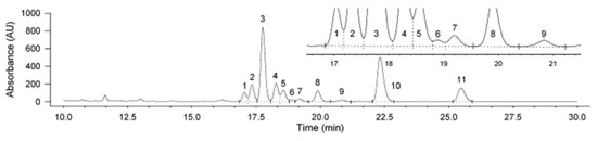 HPLC-UV chromatogram of an oyster mushroom sample submitted to saponification and subsequent LLE after UV-B treatment. Analytes identification: (1) pre-D2; (2) tachysterol2; (3) D2; (4) D3 (IS); (5) lumisterol2; (6) pre-D4; (7) tachysterol4; (8) vitamin D4; (9) lumisterol4; (10) ergosterol (provitamin D2); (11) 22,23-dihydroergosterol (provitamin D4). Adapted from [7], with permission from Elsevier, 2020.