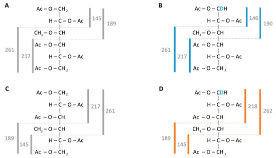 Primary fragments of 4-O- and 3-OMe-galactose after reduction and acetylation. (A + C) after common reduction performed with sodium borohydride and following peracetylation. (B + D) after our modified reduction with sodium borodeuteride and following peracetylation. Deuterium is marked in light blue. The upper two panels show 3-OMe-galactose, while the lower two show 4-OMe-galactose.