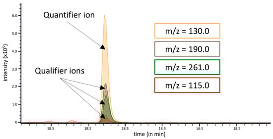 A total of 1 µL of the dichloromethane fraction was injected into the gas chromatograph (Agilent 7890B, Agilent Technologies, Santa Clara, CA, USA) with a coupled mass spectrometry detector (Agilent 5977B MSD, Agilent Technologies, Santa Clara, CA, USA). The oven was heated to the initial temperature of 200 °C and after split injection (split ratio 10:1) and subsequent 3 min hold time, a linear gradient of 2 °C/min was used to separate the different acetylated and mono-methylated monosaccharides on the Optima-225 column (25 m, 50 µm, 0.25 µm; Machery-Nagel GmbH and Co. KG, Düren, Germany). For each substance, a quantifier ion and three qualifier ions were determined and used in selective ion mode (SIM) of the MSD. Figure 2 shows qualifier and quantifier ions for 3-OMe-hexose after borodeuteride reduction and acetylation.