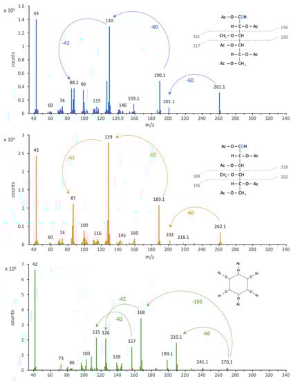 Mass spectra of the two deuterated hexose derivatives (blue = 3-OMe-hexose and orange = 4-OMe-hexose), as well as the standard myo-inositol (green) after reduction with borodeuteride and subsequent acetylation. The most intense fragments are marked and further fragmentation is explained by arrows.