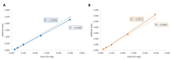 The results of the linearity tests (Table 2) showed a clear correlation of the area of the tested mass of used methylated hexose in relation to myo-inositol over the investigated range of concentrations (Figure 4). The repetition of the linearity test also showed linear regression with a good correlation.