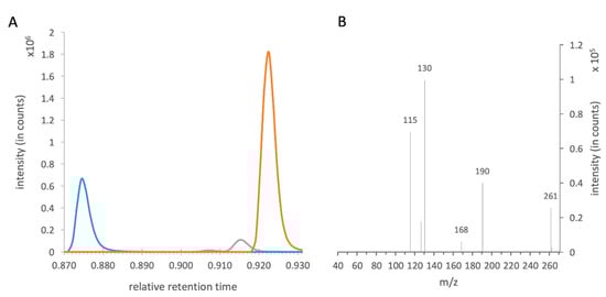 Gas chromatogram (A) of the SIM lanes for the quantifier ions of 3-OMe-hexose (blue) and 4-OMe-hexose (orange) and the unknown peak (grey). The retention time was calculated relative to the quantifier ion (m/z = 168) of myo-inositol. (B) shows the mass spectrum for the unknown peak.