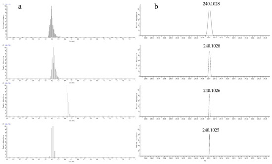 (a) Peak chromatogram (presented as data points) and (b) mass spectrum of Mefenamic acid (post-spiked sample at concentration 50 ng/L) with the resolution of 15,000 FWHM, 30,000 FWHM, 60,000 FWHM, and 100,000 FWHM (from top to the bottom).