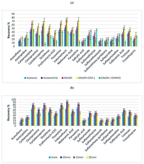 Following the optimization of the adsorption step of FPSE, desorption conditions of extraction technique such as elution solvent, volume as well as elution time were evaluated. Different solvents, such as acetone, acetonitrile, and methanol, were evaluated under the same conditions: extraction time 35 min, 10 mL of sample, 1 mL of elution solvent, stirring for 15 min–350 rpm. Acetone presented the lowest recoveries especially for polar analytes (logP < 3), followed by acetonitrile while methanol exhibited the higher elution efficiencies. To increase the desorption yield, taking into consideration the pH dependency on sorbent, formic acid or ammonia was added at various percentages (1–5% v/v) to increase the acidity or alkalinity. The results (Figure 3a) showed that the extraction efficiency reached the maximum when two consecutive elution systems of MeOH with 5% f. a v/v and MeOH with 5% v/v NH3 were employed. Analytes with maximum recovery in acidified methanol showed the lowest recovery in alkaline methanol and vice versa. This may be attributed to the different physicochemical properties of the analytes and the variation in pKa. During desorption process, the ionic state of each compound should be promoted, reducing in this way the adsorption onto the sorbent and facilitating the transfer of the analytes in elution solvent [68]. As an example, considering the pKa of fluoxetine, in alkaline pH, the compound exists in its neutral form, maintaining its adsorption onto the FPSE media, thus an acidified solvent would be more suitable for the successful desorption. For sulfonamide compounds, the same vice versa phenomenon occurs. In low pH values sulfonamides exist in their neutral form which enables the retention onto the sorbent, indicating that a desorption solvent in alkaline media would be more efficient. To overcome this observation, the elution of the target analytes was accomplished with consecutive elution steps by adding aliquots of MeOH 5% NH3 v/v and MeOH 5% f. a v/v. In this way, we take advantage of the optimal elution conditions for all target analytes by avoiding the performance of two different extraction processes, simplifying FPSE.