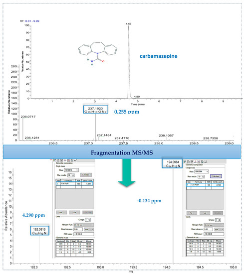 Finally, the identification of detected target compounds was employed with data-dependent MS/MS by using the predominant advantage of Orbitrap mass spectrometry, of high mass accuracy both for precursor ion and fragment ion as well. The main process was based on the criteria for both screening and confirmatory analytical methods for pharmaceutical residues according to the identification points proposed by EU Commission Decision 2002/657/EC in combination with FDA guidelines that take full advantage of the capabilities of modern HRMS instruments [71,72], and also the last update exploring the means of identification of small molecules [72]. An example of identification with MS/MS fragmentation is illustrated (Figure 4) for carbamazepine. The full scan MS spectrum of the chromatographic peak detected at 4.57 min (on the top of Figure 4), showed an abundant signal at m/z 237.1023 which corresponds within 0.255 ppm to the theoretical exact mass of carbamazepine. Additional MS/MS data shows two intense fragment ions which correspond to protonated molecules of C14H12N+ (194.096 m/z) and C14H10N+ (192.0810 m/z) with mass errors in relation to an exact mass below 5 ppm in both cases. High mass accuracy results for precursor ion as well as for its fragments confirm the presence of carbamazepine in real effluent water.