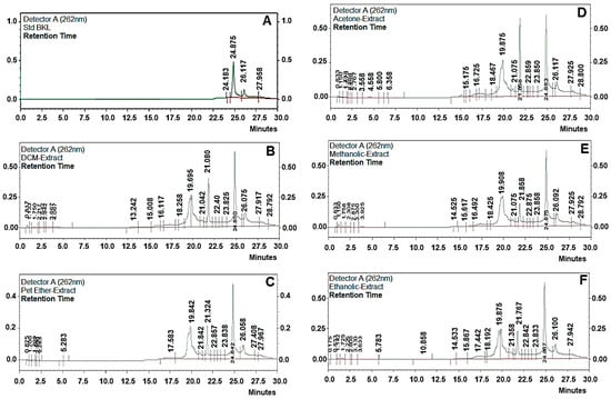 High-performance liquid chromatography HPLC chromatograms of bakuchiol (BKL) (A) standard BKL, (B) DCM extract, (C) petroleum ether, (D) acetone (E) methanolic, and (F) ethanolic extract.