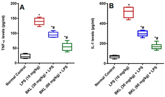 TNF-α and IL-1 in sepsis pathophysiology are perhaps the most widely researched cytokines. They are strong proinflammatory cytokines implicated in a wide variety of inflammatory infectious and non-infectious diseases [,]. TNF-α is called a chief regulator for the development of inflammatory cytokine, although the essential function of IL-1 in inflammation is well recognized [,]. TNF-α and IL-1 act synergistically to induce vascular and pulmonary dysfunctions in a shock-like state []. Moreover, TNF-α and IL-1 have also been established as key mediators to a family of pyrogenic cytokines [,]. Numerous findings have shown a role for TNF-α and IL-1in sepsis, for both laboratory animal models of septic shock and clinical trials of sepsis [,]. Bacterial endotoxin administration results in the production and release of TNF-α and IL-1 into the systemic circulation, where peak concentrations are detected from the first 1 to 2 h of LPS administration [,]. BKL is a known antioxidant and in the current study it has been shown that BKL significantly downregulates the inflammatory cytokines, which is in agreement with the previous results of Zhang and co-workers []. The results of the current study provide strong evidence that BKL can be recognized as an alternative treatment of pathogen-induced systemic inflammation.