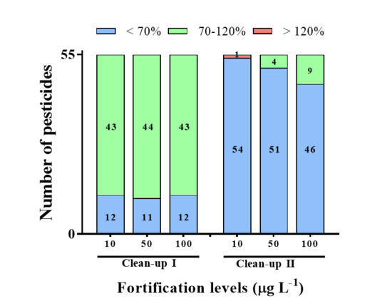 The recoveries of different clean-up procedures for LC-MS/MS at the spiked level of 10, 50, and 100 μg L−1. The different clean-up procedures used were as follows: Clean-up I (50 mg C18, 50 mg PSA, and 150 mg MgSO4); Clean-up II (50 mg C18, 50 mg PSA, 50 mg GCB, and 150 mg MgSO4).