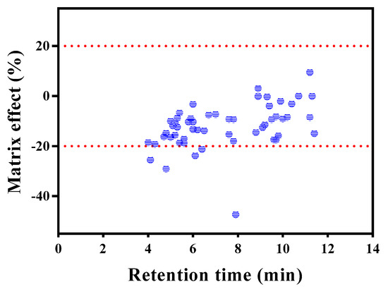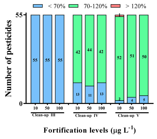 Matrix effects (MEs) are one of the main aspects that must be addressed when evaluating a multi-residue method for pesticide analysis. The slope of a calibration curve is considerably influenced by matrix components that are not removed during clean-up [27]. Minimizing MEs improves chromatographic selectivity, and dilution is an effective approach for this [18,19]. In this study, MEs (%ME) were determined on the basis of ion suppression and/or enhancement [19]. Reagent and matrix standards for each concentration (10, 50, and 100 μg L−1) were analyzed using Clean-up V. As shown in Figure 4, all compounds showed slight ion suppression, with MEs ranging from −47.3% to 9.5% (average: –11.9%), with pyrazolate exhibiting the highest ME (−47.3%). Other pesticides that showed MEs < 20% include fenbuconazole (−21.2%), fenhexamid (−23.8%), forchlorfenuron (−29.1%), and thidiazuron (−25.5%). The recoveries of these five pesticides were mostly less than 70%, except one or two fortification levels. Ion suppression and/or enhancement through MEs depend on several factors, including sample preparation procedure, sample matrix, and physicochemical properties of the pesticide [28,29]. A few alternative techniques have been suggested to compensate for MEs. Among them, external matrix-matched calibration using blank samples spiked with standard solutions is commonly employed because of its low cost and lack of complexity [29,30].