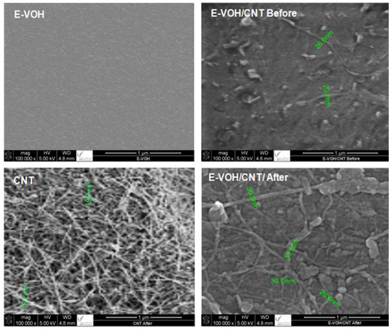 SEM images of CNTs and the surface morphology of virgin E-VOH and E-VOH/CNT nanocomposite membranes before and after use in the pervaporation process are shown in Figure 1. The CNTs image clearly shows the typical shapes characterizing these nanoparticles that resemble strands of boiled spaghetti. These particles are practically uniform and homogeneous with an external diameter size varying between 16.7 and 19.2 nm, thus reflecting the dimensions indicated on the product data sheet. The micrograph of the E-VOH membrane shows a smooth and uniform surface morphology devoid of any aggregated particles or holes or grooves, indicating that the membrane has withstood the conditions of its preparation, especially when it is subjected to a high vacuum during the drying step. However, the micrograph of the dried E-VOH/CNT-membrane shows a well-packed surface of polymer-coated CNTs uniformly dispersed and randomly oriented in the polymer matrix. The diameter size of the CNTs covered with E-VOH was uniform and varied between 20.2 and 26.6 nm, allowing a polymer layer thickness varying between 3.5 and 7.4 nm, which was estimated by simple subtraction of the diameter of the CNTs measured. As can be seen, although the image of this same membrane had swollen in the benzene/cyclohexane mixture (50:50 v/v%), the covered CNTs, some of which appear on the surface, had diameters varying between 26.6 and 39.5 nm. The diameter is an important indicator of the DS of the E-VOH/CNT hybrid membrane in the mixture to be separated. On the other hand, after repeating the pervaporation process three times under the same conditions, we found that the results were reproducible with few experimental errors while the properties of the membranes used were well preserved. So, the E-VOH/CNT membrane remained stable for all the remaining experiments.