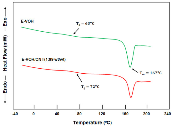 Differential scanning calorimetry (DSC) thermograms of E-VOH and E-VOH/CNT membranes.