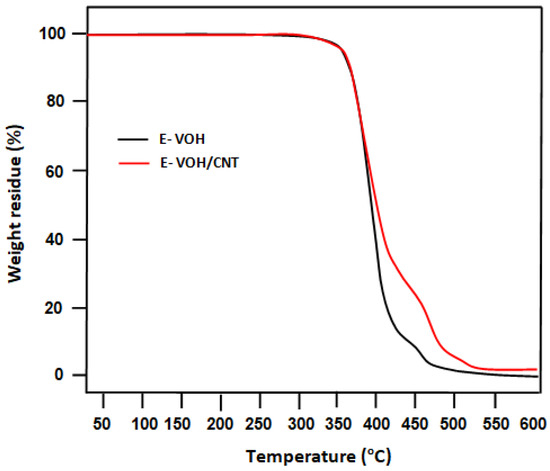 Thermogravimetry analysis (TGA) thermograms of E-VOH and E-VOH/CNT nanocomposite.