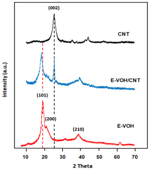 X-ray diffraction (XRD) patterns of pure E-VOH, pure carbon nanotubes (CNTs), and E-VOH/CNT nanocomposite containing 1.0 wt % of CNTs.