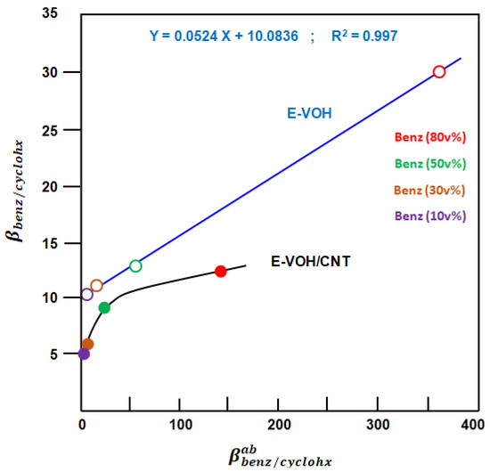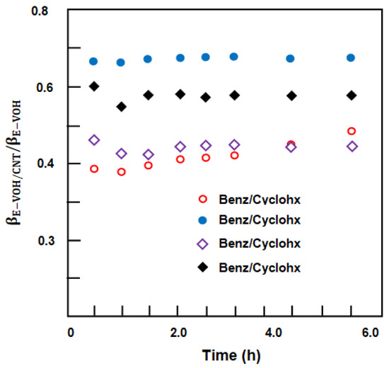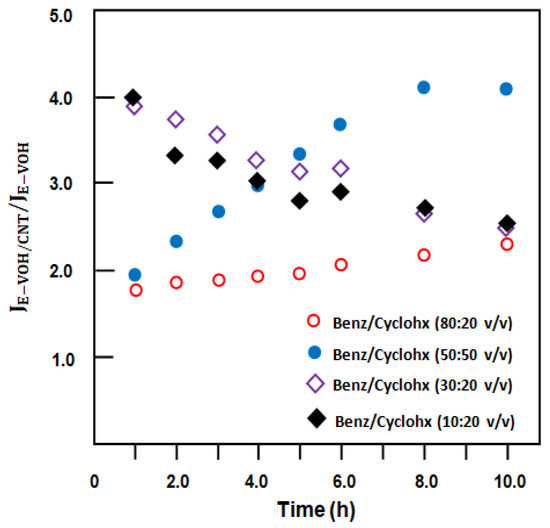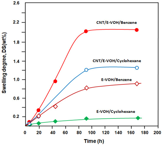 On the other hand, the addition of CNTs to E-VOH as a nanocomposite considerably improved the swelling rate of the resulting membrane. Indeed, the swelling capacity for each component significantly increased for both benzene (from 0.92 to 2.05 wt %, 2.22 fold) and cyclohexane (from 0.18 to 1.25 wt %, 6.94 fold). The increase in the swelling capacity of the CNTs-containing membrane is due to the increase in the polymer-component contact area of the resulting material. The more significant increase in the swelling degree of cyclohexane relative to that of benzene observed when CNTs was incorporated in the E-VOH membrane appeared to be due to the non-polar character of the CNTs [53], which has greater affinity for this alicyclic compound than for benzene. Although the extent of the swelling capacity of the E-VOH/CNT membrane towards cyclohexane appeared to evolve relatively faster than that of its co-component benzene, its absorbed amount always remained low, which hampered its absorption selectivity in the mixture with benzene.