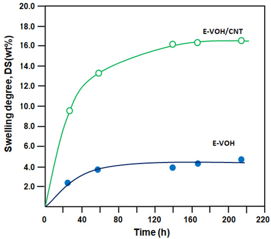 Comparison of the swelling degrees between E-VOH and E-VOH/CNT membranes in benzene/cyclohexane mixtures with equal compositions versus time measured at 25 °C.