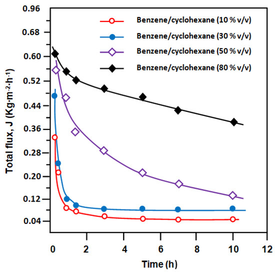 Many studies have investigated selective separation of the benzene and cyclohexane azeotropic mixture by using the PV technique to obtain the best selectivity and permeability. The decisive factor for successful separation by PV is selection of an appropriate polymer enabling development of a membrane that provides the best PV parameters for a particular separation. The affinity for polymers containing hydroxylic groups is higher for benzene than for cyclohexane because of benzene’s π electrons. This is shown by a comparison of the water solubility of benzene (1.8 g/L) with that of cyclohexane (0.0561 g∙L−1) at 298K. Therefore, several polar and hydrophilic polymers are usually used in this process, such as polyacrylonitrile [6], polyurethane [7], poly (cellulose acetate) [8], poly (vinyl chloride) [9], and poly (vinyl alcohol) (PVA) [10]. The latter is frequently used because of its high affinity for water, good stability, and ease in preparing flexible polymer membranes at low cost.
