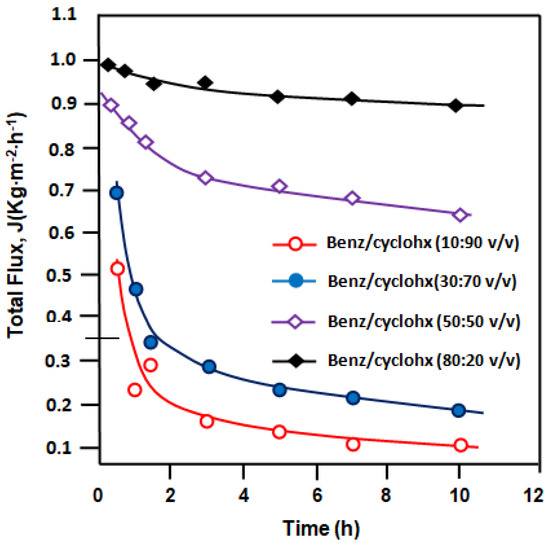 Indeed, Yamazaki et al. [11] used PVA membranes to investigate the separation of a benzene/cyclohexane mixture and obtained low total flux (0.002 kg∙μm·m−2·h−1) and good selectivity (10.0). These findings revealed that a glassy PVA membrane had low permeability to benzene, so it required modification either by chemical or physical methods. The most popular and simplest modification method was to use fillers, such as carbon molecular sieves (CMSs) [10] or β-cyclodextrin (β-CD) [4]. CMS used to fill PVA effectively increased the permeation flux in compositions of CMS/PVA from 21.87 to 59.25 g∙m−2∙h−1, which was followed by a decrease, whereas the separation factor reached 23.21 and then decreased beyond 59.25 g∙m−2∙h−1. Cross-linked (PVA) membranes filled with β-CD considerably increased the separation factor from 16.7 to 27.0 and permeation flux from 23.1 to 30.9 g∙m−2∙h−1 for a benzene/cyclohexane (50/50, wt %) mixture at 50 °C. Similarly, Park et al. [12] physically modified the pervaporative properties of PVA by blending this polymer with polyallylamine to investigate the benzene/cyclohexane separation by pervaporation and obtained a maximum flux of 2.3 kg∙μm·m−2·h−1 and a selectivity of 11.9. The separation of aromatic compounds from aliphatic mixtures is quite challenging. A novel graphite-filled poly(vinylalcohol)- Chitosan (PVA-CS) hybrid membrane for PV of benzene-cyclohexane mixtures has been reported [13,14]. It was found that both of the permeation flux and the separation factor (SF) improved with incorporation of graphite. The presence of specific σ- and π-bond interactions between graphite and benzene enhanced the separation performance.