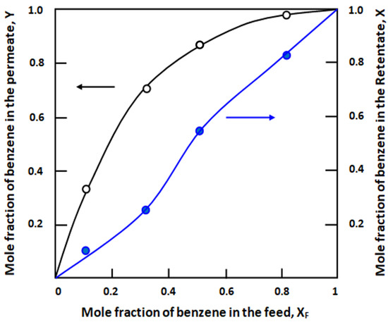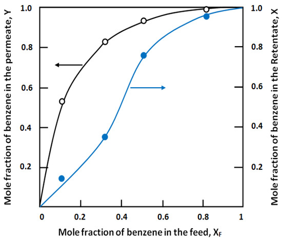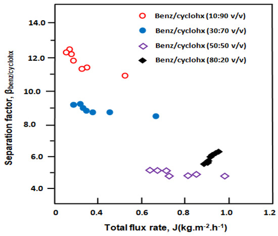 where and are the weight fractions of benzene and cyclohexane in the permeate, respectively, and and are the weight fractions of benzene and cyclohexane in the feed mixture, respectively.