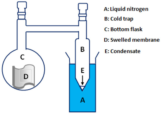 Desorption of the benzene/cyclohexane mixtures from the membrane was performed by using the apparatus of Scheme 2. The membrane that swelled in the mixture until saturation was placed into a bottom flask (C) connected to a cooled trap (B). The vapor of the mixture, created by the dramatic diminution of the pressure caused by the liquid nitrogen (A), was then driven to the cold trap. The compositions of the absorbed mixture collected in the cold trap were analyzed by gas chromatography (Agilent 6850, Santa Clara, CA, USA). Helium was used as carrier gas with a flow rate of 10 mL/min. Samples taken were injected using a 10 μL-syringe. The capillary column used had a length of 30 m and an internal diameter of 0.25 mm. The stationary phase used was non polar made of 5% phenyl poly silpenylene-silicone impregnating the internal face of the column with a thin layer of 0.25 µm. The oven temperature was maintained at 200 °C for all analyses. To minimize errors due to the different experimental processes that may have affected the swelling results (sorption, diffusion, and desorption), the values were taken from the arithmetic mean of two measurements and the error bar was taken into account in calculations.