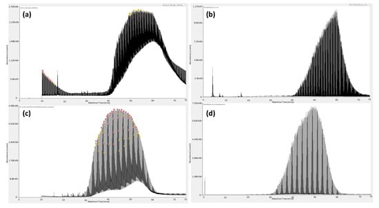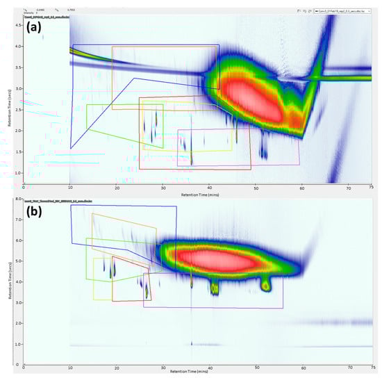 The ion source tailing is extremely prominent in the unprocessed two-dimensional chromatograms, as seen in Figure 5a,c. The heavy compounds within the UCM showed as a broad band across the entire two-dimensional space after data processing, making it almost impossible to detect any trace analytes. Baseline correction and data processing were required in order to achieve a two-dimensional chromatogram with distinguishable peaks. Unprocessed two-dimensional chromatograms acquired with the FID showed no tailing, with a clear distinction of groups surrounding the UCM (Figure 5b,d). Overall, the combination of the closed source design, heavy sample matrix, and lower flow entering the ion source led to substandard peak shapes. This was remedied by data processing built into the ChromSpace software. All TOF-MS chromatograms presented herein for both platforms were processed in this way to distinguish trace analytes.