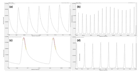 - Murphy, R.E.; Schure, M.R.; Foley, J.P. Effect of sampling rate on resolution in comprehensive two-dimensional liquid chromatography. Anal. Chem. 1998, 70, 1585–1594. [Google Scholar] [CrossRef]