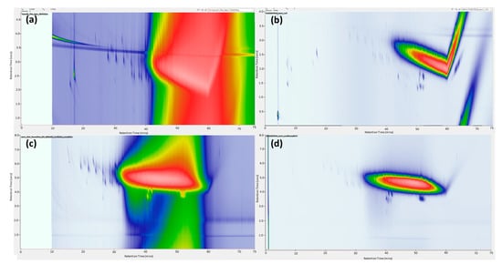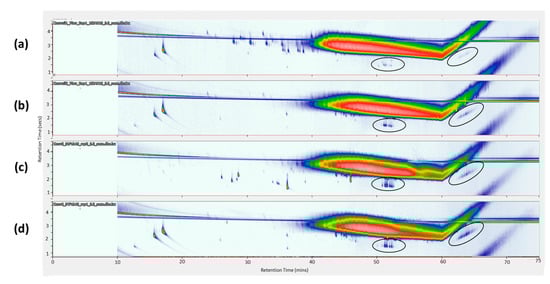 GC × GC-TOF-MS contour plots of (a) synthetic oil from Brand A with viscosity 10W-30; (b) synthetic oil from Brand B with viscosity 10W-30; (c) synthetic oil from Brand A with viscosity 5W-20; and (d) synthetic oil from Brand B with viscosity 5W-20, illustrating the separation with the flow-based modulator platform.