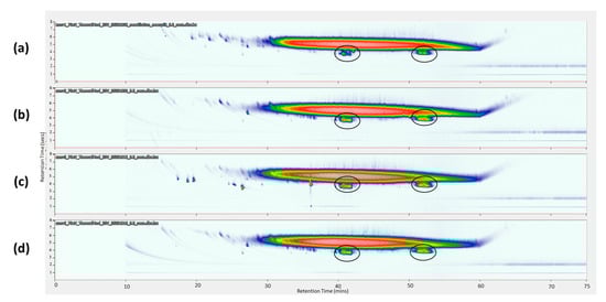 Figure 7 illustrates the conventional oil separations for the thermal modulator platform. Each chromatogram displays several homologous groups, a large UCM, and two distinct groups separated from the UCM (indicated with black circles). The main differences were observed in the nature of the alkanes eluting late in the 2D, as well as in the distribution of hydrocarbons within the UCM. Specifically, in Figure 7a, the brand A 10W-30 conventional oil contained significantly more straight-chain alkanes when compared to the three other conventional samples (b–d). Brand A 5W-20 conventional oil (Figure 7c) contained a higher concentration of di- and tri-substituted naphthenes when compared to the other conventional samples (a, b, and d). When comparing the distribution of compounds within the UCM of the four conventional samples, it could be seen that each blend was slightly different from the others. Brand A 10W-30, as seen in Figure 7a, had a relatively consistent distribution of hydrocarbons within the UCM. Brand B 10W-30 conventional oil (Figure 7b) had a distribution that extended further toward heavier hydrocarbons. Brand A and B 5W-20 oils contained lower concentrations of high-molecular-weight hydrocarbons, which explains their lower viscosity at low temperatures. A key similarity in all four samples was the presence of two distinct groups (indicated by the black circles) separated from the UCM at about 40 and 50 min. Further investigation of these groups will be discussed in Section 3.4.