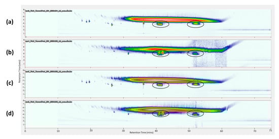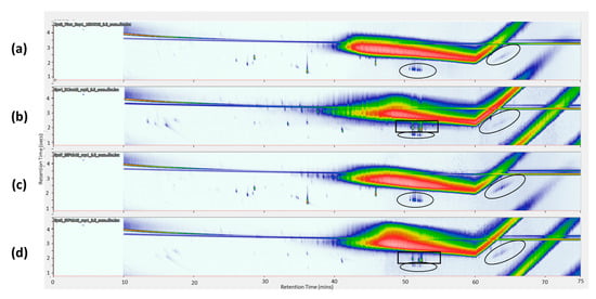 GC × GC-TOF-MS contour plots of (a) synthetic oil from Brand A with viscosity 10W-30; (b) synthetic oil from Brand B with viscosity 10W-30; (c) synthetic oil from Brand A with viscosity 5W-20; and (d) synthetic oil from Brand B with viscosity 5W-20, illustrating the separation with the thermal-based modulator platform.