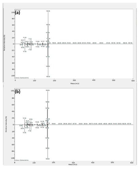 GC × GC-TOF-MS mass spectra of (a) diphenylamine with the flow-based platform and (b) diphenylamine with the thermal-based platform.