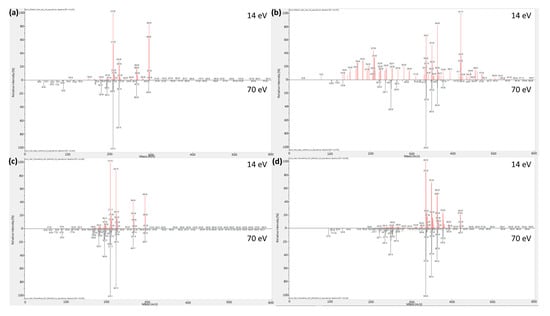 GC × GC-TOF-MS mass spectra comparison using hard and soft ionization for the identification of (a) monononyl-diphenylamine with the flow-based platform; (b) dinonyl-diphenylamine with the flow-based platform; (c) monononyl-diphenylamine with the thermal-based platform; and (d) dinonyl-diphenylamine with the thermal-based platform.