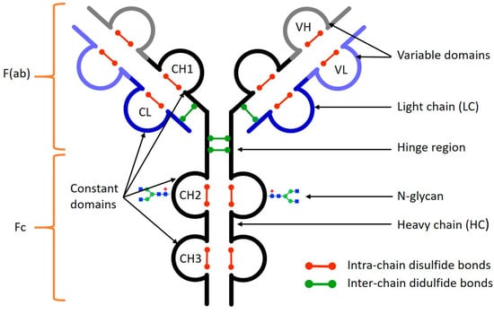 Monoclonal antibodies are highly complex glycoproteins from the immunoglobulin G class with a large molecular weight (MW ≈ 150 kDa). They consist of two light chains (LC, MW ≈ 25 kDa) and two heavy chains (HC, MW ≈ 50 kDa) of polypeptides linked together by inter-chain disulfide bonds and non-covalent interactions (Figure 1). Intra-chain disulfide bonds form constant and variable domains in the polypeptide chains [4]. Variable domains comprise complementarity determining regions (CDRs) that are considered as signature peptides responsible for antigen-binding specificity [5]. The constant region is characteristic for a given immunoglobulin class (IgG, IgM, IgA, and IgE) or subclass (IgG1, IgG2, IgG4). Monoclonal antibodies are the products of a long manufacturing process wherein many post-translational modifications (PTMs) occur on the polypeptides chains like N-terminal pyroglutamate formation, C-terminal lysine truncation, and glycosylation, adding another level of complexity [6]. Biantennary glycans are linked to an asparagine residue in the heavy chain and some mAbs possess several glycosylation sites on HCs and LCs such as cetuximab [7]. These N-glycans are highly heterogeneous and affect the anti-inflammatory properties of mAbs resumed on the following effector functions: antibody dependent cell-mediated cytotoxicity (ADCC) and complement dependent cytotoxicity (CDC) [8]. Other enzymatic, physical, and chemical modifications can occur during the manufacturing steps of mAbs. These modifications may cause micro-variations in size and/or charge (e.g., asparagine deamidation, pyroglutamate formation, methionine oxidation, C-terminal clipping, and cysteine-related modifications) or promote macro-variations such as denaturation, fragmentation or aggregation [6,9]. The majority of micro-heterogeneities are considered critical quality attributes (CQAs) because they may alter the pharmacokinetic and pharmacodynamic properties of mAbs such as half lifetime, antigen binding, anti-inflammatory property, or increase their immunogenicity [10,11]. The International Conference on Harmonization (ICH), FDA, and EMA guidelines as well as pharmacopeia monographs require the physicochemical characterization of micro-heterogeneities and the evaluation of their impact on the quality, efficacy, and safety of mAbs [12].